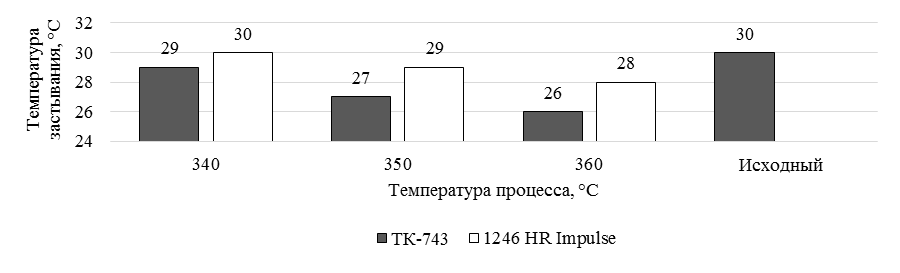 В следствии протекания процесса гидроочистки мазута, происходит удаление парафиновых углеводородов, которые являются главной причиной высокой температуры застывания. Удаление парафинов делает мазут более устойчивым к застыванию. Уменьшение температуры застывания свидетельствует об улучшении качества мазута. Он становится более пригодным для использования в холодных условиях, где требуется топливо, которое не замерзает.