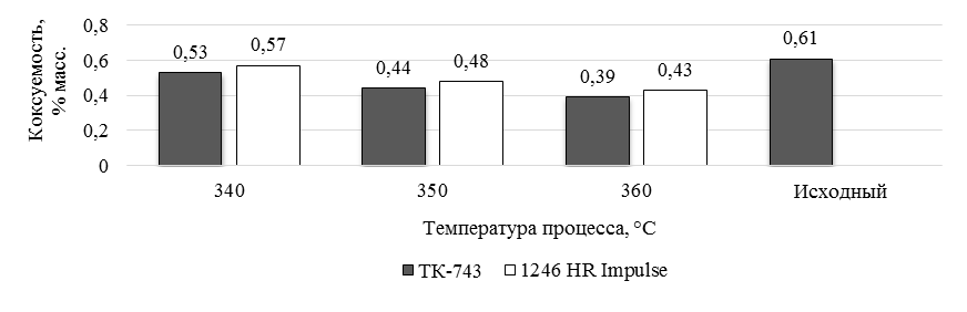 2. При повышении температуры наблюдается тенденция к понижению значений основных показателей качества, при чем при использовании катализатора ТK-743 наблюдается наибольший эффект: температура застывания снижается на 13 %, плотность практически не изменяется, кинематическая вязкость снижается на 28 %, коксуемость – 36 %. Таким образом, при заявленных режимах гидроочистки качество мазута не ухудшается и его можно использовать в качестве товарного мазута.