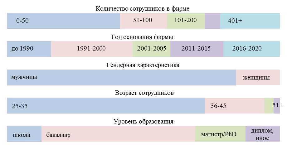 На момент проведения опроса респонденты работали в компаниях, отличающихся по времени основания. Так, 16,1 % компаний были основаны в 1990 г. или ранее, а 29,9 % – в период с 1991 по 2000 г. Компании, основанные в период с 2001 по 2005 г., составили 13,8 % выборки, в то время как 19,5 % были основаны в период с 2011 по 2015 г., и 20,7 % – в период с 2016 по 2020 г. Поскольку различные компании могут придерживаться различных политик управления знаниями и стратегий взаимодействия с сотрудниками, такое разнообразие может оказывать влияние на современную рабочую среду и технический прогресс.