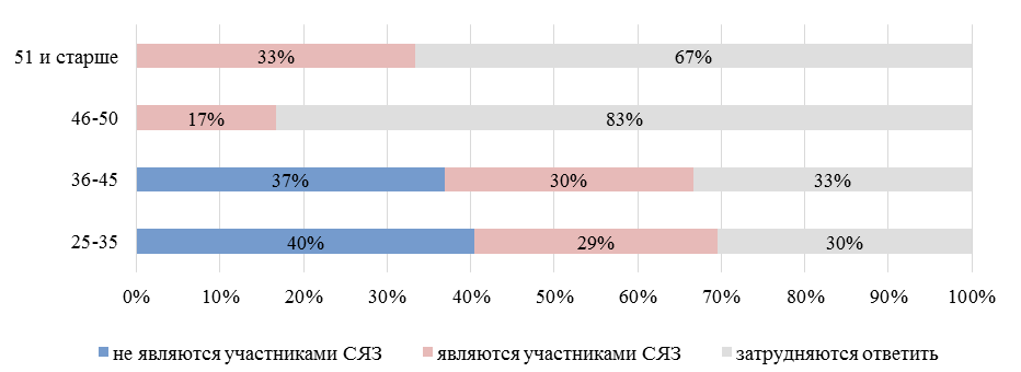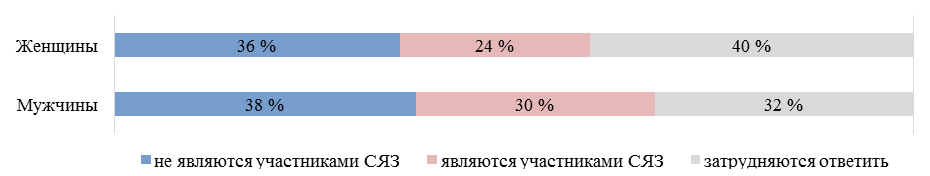 На рис. 2 представлены ответы по гендерному признаку, где позиция «не являются участниками СЯЗ» содержит такие ответы, как «абсолютно не согласен» и «не согласен» с гипотетической ситуацией о СЯЗ, и наоборот: «являются участниками» – «абсолютно согласен» и «согласен».