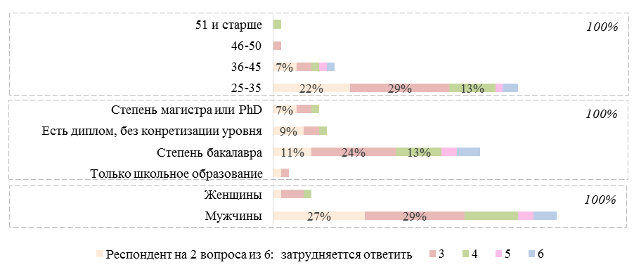 Итак, портрет респондента, склонного к СЯЗ, может быть представлен следующим образом: мужчина со степенью бакалавра в возрасте 25–35 лет (рис. 7), где 7 % (от ответов всех респондентов, которые ответили на 2 и более ответа положительно) ответили на 2 ответа положительно; 19 % – на 3; 10 % – на 4; 2 % – на 5; 5 % – на все 6 вопросов.