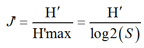 The Shannon index was accompanied by the Piélou equitability or equi-distribution index (J’) which measures the distribution of individuals within species, independently of species richness. It can vary from