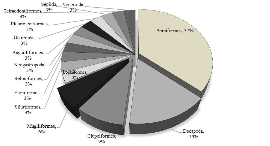 Specific composition. The current living organisms composition of the Cotonou Estuary is shown in Table 3. The order best represented in number of species in the waters of this environment is that of the Perciformes (12 species; 37%). This order is followed by the Decapoda with 5 species (15%), the Clupeiformes with 3 species (9%) and the Mugiliformes with 2 species (6%). The others orders (11) consist of a single species each (or 33% of all species) (Fig. 2).