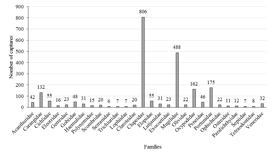 The distribution of the biomass of the different species presents two modes, the clupeidae 806 kg followed by the mugilidae 488 kg which constitute which live both in the sea and in brackish waters.
