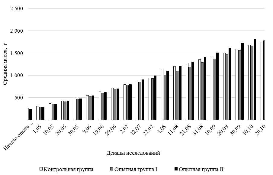 Контрольная группа получала полнорационный комбикорм (ОР) для лососевых рыб серии «Рост», первая опытная группа получала концентрат рапсового белка в количестве 4 %, вторая опытная группа получала концентрат рапсового белка в количестве 6 % в составе комбикорма. Контрольный и опытные комбикорма разработаны и производились на комбикормовом заводе ООО «Прометрика» г. Саратов.