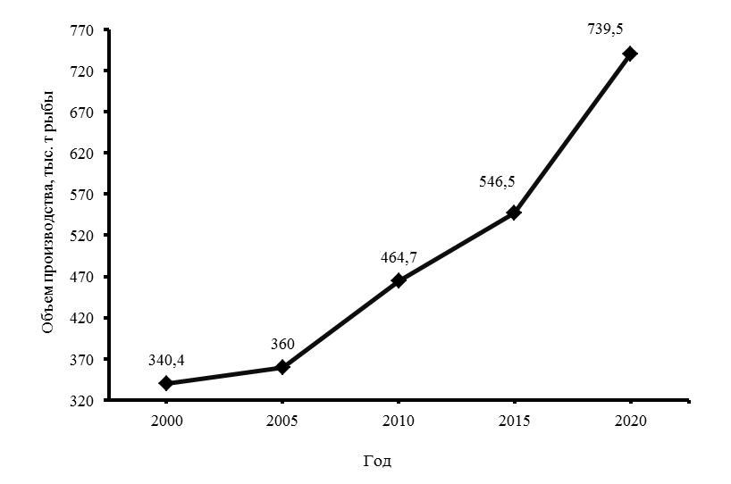 Аквакультура – важнейшая часть производства рыбной продукции. С каждым годом потребление продуктов рыбной отрасли растет. Согласно данным ФАО, в 2022 г. объем мирового производства продукции рыболовства и аквакультуры достиг 223,2 млн т. Из них 185,4 млн т пришлось на рыбные и нерыбные объекты, а 37,8 млн т – на водоросли. В период с 1961 по 2021 г. общий объем потребления рыбной продукции на душу населения вырос с 9,1 до 20,7 кг живого веса и, соответственно, увеличился на 89 % за этот промежуток времени. Такая динамика обуславливается ростом спроса на рынке, развитием технологий консервации и распределения продукции, изменением по-требительских предпочтений и ростом доходов населения [1].