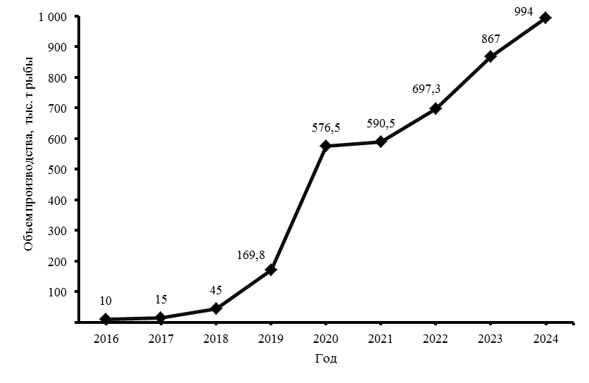 В настоящее время аквакультура представляет собой устойчивое решение для удовлетворения постоянно растущего спроса на рыбную продукцию. Аквакультура обладает огромным потенциалом в обеспечении продовольствия, питания и, как следствие, доходов и средств к существованию для множества людей во всем мире [1]. На сегодняш-ний день аквакультура является приоритетным и активно развивающимся видом деятельности рыбного промысла, что и отражается в Стратегии развития агропромышленного и рыбохозяйствен-ного комплексов Российской Федерации на долгосрочный период до 2030 года [2].