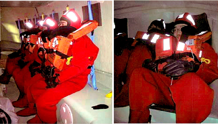 Через 30–60 мин после начала эксперимента люди в шлюпке подвергались приступам морской болезни, при этом 49 % участников чувствовали значительное недомогание, а у 29 % началась рвота. Конструкция стандартной закрытой шлюпки предрасполагает к укачиванию из-за стесненного пространства, отсутствия визуальной ориентации и расположения людей на сидениях без фиксации корпуса и головы (рис. 5). В несколько лучшем положении находятся спасающиеся в свободно падающих шлюпках за счет полугоризонтального расположение кресел авиационного типа с подголовниками, фиксацией всего тела, и увеличенного внутреннего объема на одного пассажира [10].