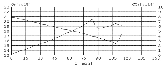 Fig. 9. Carbon dioxide and oxygen content at the third stage of the experiment