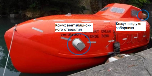 Полностью закрытые спасательные шлюпки используются не только на судах, они нашли широкое применение на плавучих буровых установках. Главным требованием к конструкции была выдвинута возможность преодолевать зону горящей на воде нефти в течение времени не менее 8 мин, при этом автономная система воздухоснабжения должна обеспечить работу двигателя и достаточный подпор для предотвращения попадания внутрь токсичных газов [9]. Вопрос, как в них будут чувствовать себя 40–60 человек, тогда не рассматривался.