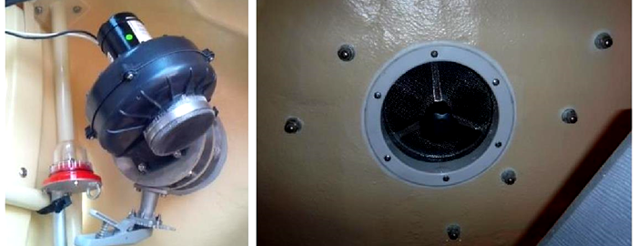 Для упрощения конструкции воздуховоды внутри шлюпки не устраивались. Все отверстия были оборудованы средствами герметизации. Питание подавалось от штатного генератора, вырабатывавшего ток 12 А напряжением 12 В, с приводом от двигателя шлюпки.