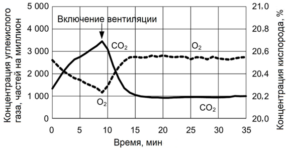 С учетом вышеизложенных результатов испытаний делегация КНР предложила ввести коэффициент безопасности 1,1 к теоретическим расчетам и соответственно увеличить нормативную производительность вентиляции до 6,45 м3/ч на человека [11].