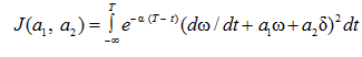Коэффициент затухания экспоненты α характеризует интервал осреднения квадрата невязки е2(t) и может быть подобран экспериментально. В дальнейшем будем предполагать, что процесс рыскания буксируемого судна наблюдается достаточно долго, чтобы принять нижний предел в критерии равным –∞. Таким образом, чтобы стабилизировать и минимизировать рыскание буксируемого судна, критерий задается так: