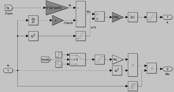 На рис. 4 представлена структура блока, посредством которого выполняется имитация вентиляторного момента нагрузки гребного винта в нормальном ходовом режиме и в условиях качки. Также в этом блоке производится вычисление коэффициента нагрузки на основании уравнения второго закона Ньютона для вращательного движения и уравнения зависимости момента двигателя от тока Iq. Значение этого коэффициента используется для корректирования коэффициентов регулятора скорости.