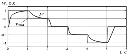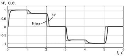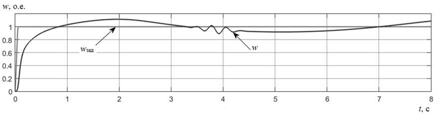 На рис. 5 представлены результаты имитационного моделирования работы гребного синхронного электропривода на вентиляторную нагрузку с косинусоидальным изменением коэффициента нагрузки при оголении гребного винта на 4-й с (wзад – задание скорости, о. е.; w – текущая скорость двигателя, о. е.).