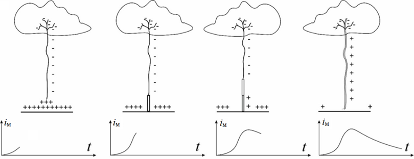 Рис. 2. Этапы развития обратного разряда молнии и график тока: