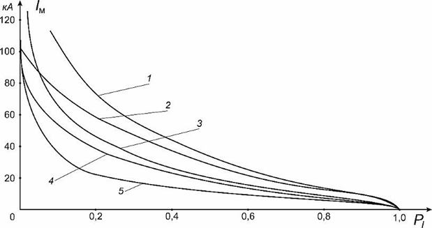 Кривые токов молнии отличаются не из-за климатических особенностей районов, где были выполнены исследования, а вследствие разных методов замеров и подсчетов данных из различных источников информации. Кривая 3 на рис. 4 максимально приближена к расчету показательного закона распределения вероятностей с небольшой долей погрешности: