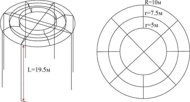 Рис. 7. Система заземления с концентрическими кольцами и вертикальными стержнями