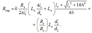 Поскольку на работу электролитического заземления оказывает существенное влияние такой эффект, как степень выщелачивания электролита в грунт с насыщением почвы свободными ионами, в формулу вводится поправочный коэффициент k = 0,4 ≈ 0,25, который зависит от текстуры грунта, величины естественной влажности. Значение k получено эмпирически на основе исследования применения электролитических заземлителей в разных условиях эксплуатации [9].