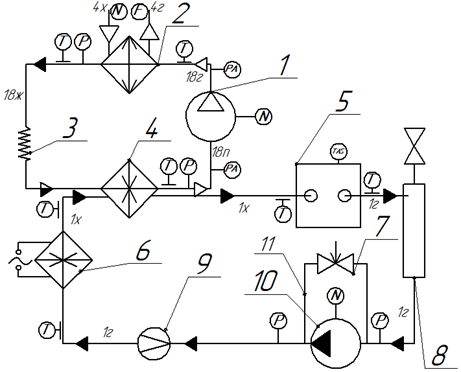 6 – heat exchanger with electric heater; 7 – control valve; 8 – receiver; 9 – rotameter; 10 – pump; 11 – bypass line
