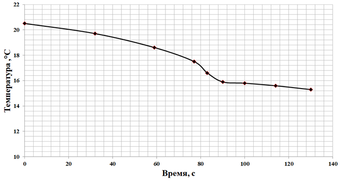 Для экспериментального образца зависимости изменения температуры теплоносителя T от времени t разбиваются на кубическую зависимость при быстрой стабилизации и квадратичную при выходе на установившийся режим: