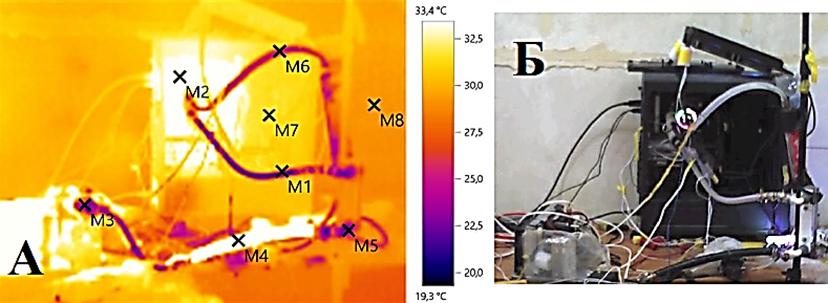 а – картинка с тепловизора; б – фото компьютера, подключенного к стенду