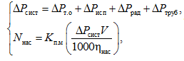 где ∆Pсист – общие потери напора в системе, Па; ∆Pисп – потеря напора теплоносителя в испарителе холодильной машины, Па; ∆Pтруб – потеря напора теплоносителя в трубопроводе, Па; ∆Pт.о – потеря напора в жидкостном теплообменнике, Па; ∆Pрад – потеря напора в воздушном теплообменнике, Па; Kп.м – коэффициент, учитывающий повышение мощности для регулировки производительности системы охлаждения.