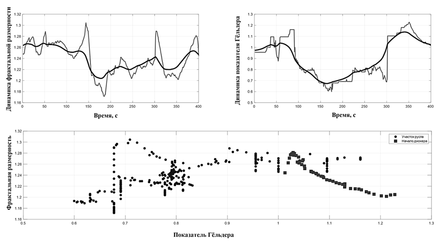 Рис. 2. Совместная динамика фрактальной размерности и показателя Гёльдера:
