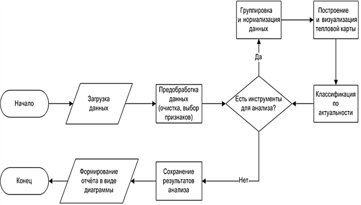 и учитывая необходимость структурированного подхода для извлечения ценных знаний из большого и разнородного массива данных опроса, было решено разработать новый метод классификации средств разработки. Данный метод предназначен для систематизации анализа информации, содержащейся в датасете SO, с целью объективной оценки востребованности и областей применения различных инструментов. Общая блок-схема предложенного метода, иллюстрирующая последовательность этапов – от загрузки и предобработки данных до группировки, анализа актуальности и визуализации результатов, – представлена на рис. 1.
