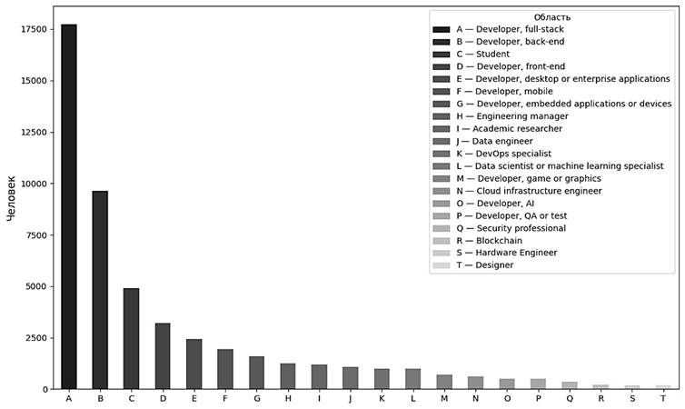 Из-за большого количества столбцов была разработана специальная процедура, позволяющая отобрать несколько релевантных для цели этого исследования атрибутов, содержащих, в частности, информацию о типе разработчика (DevType) и используемых ЯП (LanguageHaveWorkedWith). После определения списка необходимых столбцов DataFrame фильтруется, оставляя только указанные атрибуты, что способствует уменьшению объема данных и повышению эффективности дальнейшего анализа. Далее полученный датасет был проанализирован на предмет наличия пропущенных значений. Количество пропущенных значений варьируется от колонки к колонке. Важными для дальнейшего анализа и классификации являются колонки DevType и LanguageWorkedWith. Количество пропущенных в них значений – 5 992 и 5 692 соответственно. Строки с пустыми значениями в этих столбцах были удалены. Затем датасет был проверен на количество уникальных значений функцией df.nunique(). Большое количество уникальных значений обусловлено типом хранимых данных. Разработчики указывают сразу несколько инструментов, с которыми работали. В результате данные в колонке приобрели следующий вид: Bash/Shell (all shells); Go; HTML/CSS; Java; JavaScript; Python; TypeScript. Это касается всех колонок, кроме DevType. Далее был проанализирован список уникальных значений колонки DevType с целью определить роли разработчиков и исключить неподходящие. Список довольно обширен и содержит записи как областей, непосредственно связанных с разработкой, так и косвенно относящихся к ней. Для исключения выбраны следующие типы: Developer Experience, Developer Advocate, Database administrator, Research & Development role, System administrator, Senior Executive (C-Suite, VP, etc.), Data or business analyst, Educator, Product manager, Scientist, Engineer, site reliability, Marketing or sales professional, Other (please specify). В результате количество уникальных записей сократилось с 34 до 20 (табл. 2), число разработчиков представлено на рис. 2.