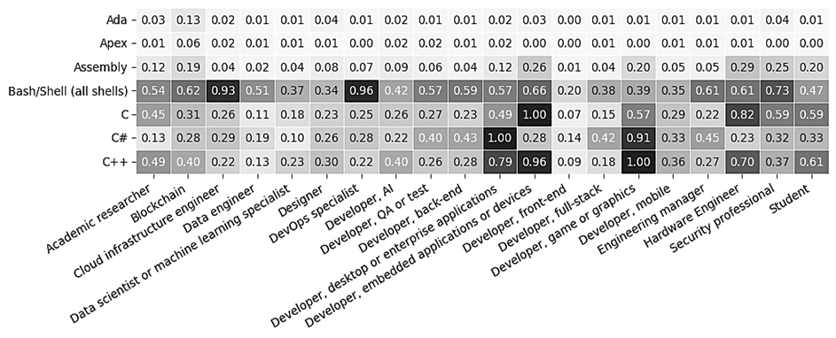 На рис. 3 представлен фрагмент этой тепловой карты, демонстрирующий распределение для 6 языков. На этом фрагменте заметно, что некоторые языки, например язык C++ или Bash/Shell, показывают относительно высокие значения для нескольких групп разработчиков, в то время как другие, например Ada или Assembly, имеют в целом более низкие показатели среди представленных на фрагменте типов специалистов. Это иллюстрирует общую тенденцию разной степени популярности и специализации ЯП.