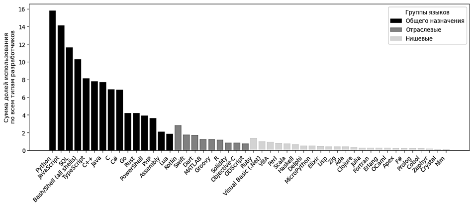 типов специалистов. Научная новизна работы заключается в разработке и применении количественного метода классификации ЯП, основанного на анализе распределения их популярности среди различных типов специалистов. Метод использует данные опроса SO и статистические метрики, что позволяет объективно классифицировать языки как инструменты общего назначения, отраслевые или нишевые. Такой подход формирует структурированное представление об актуальном технологическом ландшафте и может использоваться для поддержки решений в области стратегического планирования разработки программного обеспечения. Ключевым результатом работы является формирование комплексного представления о текущих технологических трендах и областях применения различных инструментов. Были выявлены как инструменты общего назначения, широко используемые специалистами разных профилей, так и отраслевые решения, востребованные в конкретных сферах разработки. Полученные данные позволяют получить структурированное представление о технологическом ландшафте и могут быть полезны как начинающим, так и опытным разработчикам для выбора оптимального набора инструментов. Дальнейшие исследования будут направлены на разработку рекомендательных систем, позволяющих автоматически подбирать оптимальный стек технологий для решения конкретных задач.