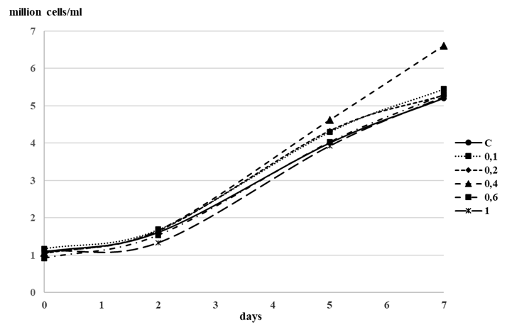The effect of exposure to IBA in the concentration range of 0.1-1 × 10–5 mol. L–1 on the growth dynamics of Isochrysis galbana in an enrichment culture was studied. The study showed a slight stimulating effect on culture growth (15.5%) after 5 days of cultivation only at a phytohormone concentration of 0.4 × 10–5 mol. L–1. The figure shows average culture density values from experiments in triplicate (p ≤ 0.05) (Fig. 1).