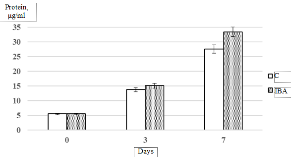 Carbohydrate synthesis activity is a key characteristic in plant development. On day 3 of cultivation, IBA was found to stimulate carbohydrate accumulation by 15% compared to the control group (Fig. 4: еrror whiskers represent standard deviation from the mean value (p ≤ 0.05)).
