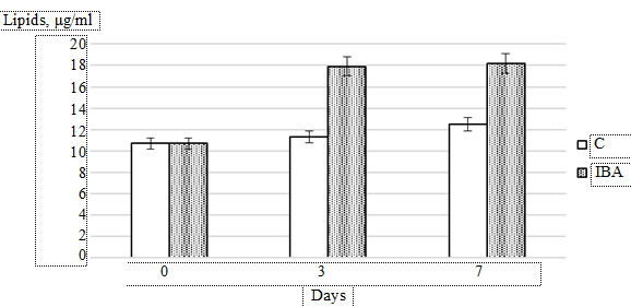 Lipids are the main energy component of microalgae. The study of lipid dynamics in Isochrysis galbana culture showed that under the IBA exposure the lipid content in the experimental group on day 3 of cultivation was 17.9 μg/mL. Further cultivation did not have an effect on the lipid content in either the experimental or control groups (Fig. 5: error whiskers represent standard deviation from the mean value (p ≤ 0.05)).