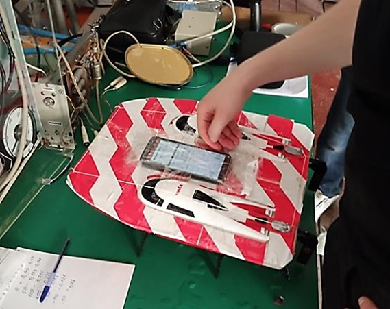It should be understood that the ship model produces non-uniform rectilinear motion. From the beginning of the motion to the stop there is a change of speed, i.e. acceleration. It is necessary to take this into account and find the average speed in the section where the ship is moving uniformly. For this purpose, the software Sensor Logger was used, which was installed on a phone. The phone itself was fixed on the test model (Fig. 6, 7).