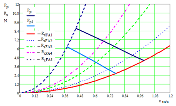 Fig. 10. Graph of the resistance of FA Rx = f (v) and disposable thrust graphs Pp = f (v), Pp1 = f (v)