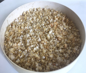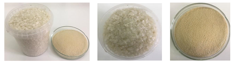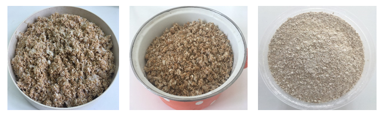 Известно, что зрелая икра салаки имеет размер от 1,0 до 1,5 мм и является высокобелковым продуктом со следующим химическим составом: вода – 65,0 %, белок – 21,7 %, жир – 9,4 %, зола – 3,9 %, а чешуя салаки (высушенная без икры) имеет повышенное содержание минеральных веществ: вода – 12,90 %, белок – 38,01 %, жир – 0,20 %, зола – 48,27 % [12, 14]. Массовая доля исследуемой прилипшей к чешуе высушенной икры салаки составила 56,4 %, ее очищенной чешуи, соответственно, 43,6 %. Общий химический состав исследуемой высушенной чешуи нерестовой салаки (включая Ca и P), выраженный в массовых долях (в %), следующий: влаги – 6,20 ± 0,4; белка – 78,89 ± 4,73; жира – 0,60 ± 0,4; углеводов – 1,40; общей золы – 12,88 ± 0,002; в том числе кальция – 3,13 ± 0,4; общего фосфора – 2,09 ± 0,4. Согласно полученным данным, высушенная чешуя нерестовой салаки является высокобелковым продуктом (78,89 %). Ввиду высокой клеящей способности икры процесс сушки нерестовой чешуи салаки сопровождается образованием комков, требующих постоянного дробления, а полученная высушенная чешуя в процессе последующего ее измельчения образовывает плотную вязкую массу, препятствуя нормальной работе оборудования. Поэтому перед сушкой чешую нерестовой салаки (с прикрепленной к ней ее икрой) смешивали с крупой пшеничной в массовом соотношении 1 : 3 (определено эмпирически, т. к. при данном соотношении в процессе сушки не образуется крупных комков, что способствует улучшению условий сушки и значительному сокращению ее продолжительности, при этом высушенная смесь легко измельчается до состояния муки) и высушивали воздухом (40–60 °С) до влажности не более 13 %; полученную высушенную смесь обрабатывали в измельчителях ножевого типа. Внешний вид смеси пшеничной крупы с нерестовой чешуей салаки (до и после сушки), а также полученной из нее растительно-рыбной добавки представлен на рис. 4.