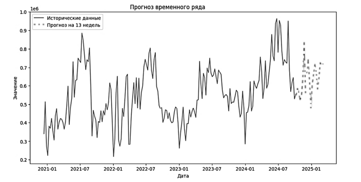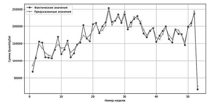 Далее рассмотрим более сложную модель, которая уже может включать в себя дополнительные feature-переменные – градиентный бустинг. Принцип работы заключается в постепенном итеративном наращивании более слабых моделей для получения точного прогноза. Свое название метод получил благодаря использованию принципа градиентного спуска, где на каждой итерации считается градиент функции потерь, последующие модели обучаются на нем, улучшаясь в нужном направлении. Ключевым фактором успешного применения градиентного бустинга является использование корректных feature-переменных. Из полученных данных удалось создать 24 статистических переменных: 13 лагов переменной, среднее, медиана, стандартное отклонение за 4, 8 и 13 недель, дельты первого лага и среднего, медианы. Также 5 временных переменных, описывающих год, месяц, номер недели, сезон и квартал. Наиболее важными по итогу прогнозирования оказались месяц, первый лаг, среднее за 4 недели. Результат представлен на рис. 6.