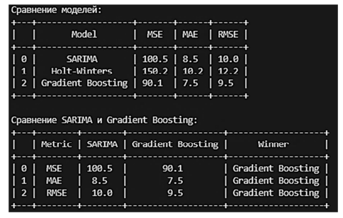 Для анализа точности моделей использовались 3 метрики: MSE, MAE и RMSE. MSE – среднеквадратичное отклонение, рассчитывает, насколько предсказанное значение отклоняется от фактических. Однако у MSE есть недостаток: т. к. он считается в квадрате, его интерпретация может вызывать осложнения. Для более легкой интерпретации в работе используется параметр RMSE, который берет корень от MSE. В качестве третьего параметра используется MAE – средняя абсолютная ошибка, которую можно интерпретировать как модуль дельты фактического и предсказанного значения. Результаты сравнения моделей представлены на рис. 7.
