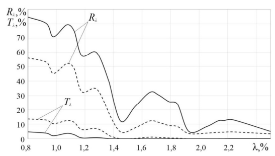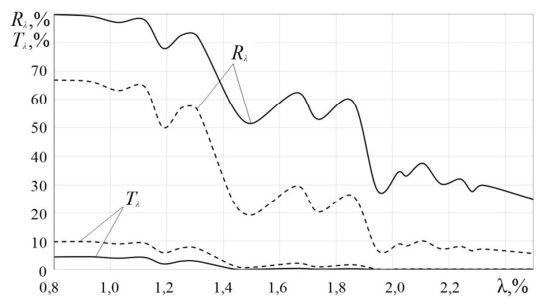 Примеры полученных на спектрофотометре данных о спектрах отражения Rλ, %, и Tλ, %, в отношении объектов исследования представлены на рис. 1 и 2.