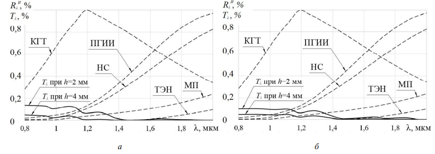 Выбор диапазона инфракрасной области спектра обусловлен техническими характеристиками спектрофотометра UV-Vis-NIR Cary 5000 (Varian), вместе с тем диапазон согласуется с литературными данными аналогичных исследований в отношении других биополимерных материалов [6, 10–13].  Диапазон влажности исследуемого материала в отношении нижней границы обусловлен требованиями ГОСТ 11293-2017 к качеству сухого желатина, в отношении верхней – свойствами образуемой из раствора ихтиожелатина пеноструктуры, при которых достигается наибольшая стабильность пены, что, в свою очередь, позволяет обеспечить более эффективную реализацию процесса влагоудаления [6].  Верхняя граница глубины оптически тонкого слоя соответствует его толщине h, м, выбор которой основан на эмпирических данных, полученных в результате предварительных экспериментальных исследований пеносушки ихтиожелатина при конвективно-радиационном энергоподводе [8].  Значение величины Еп (см. табл. 1) для исследований выбрано на основе данных предварительных экспериментов по реализации процесса конвективно-радиационной пеносушки гранул ихтиожелатина в виброожиженном состоянии, а также данных научно-технической литературы [6, 8]. Расчет оптических характеристик проводился с использованием сведений об относительной интенсивности электромагнитного излучения в рассматриваемом диапазоне спектра следующих генераторов излучения [6, 10, 11]: металлическая плитка (МП), кварцевый излучатель (кварцевая галогенная трубка КГТ-220-1000), трубчатый электронагреватель (ТЭН), плитка газового инфракрасного излучения (ПГИИ), нихромовая спираль в кварцевой трубке (НС).