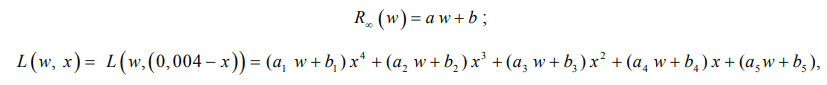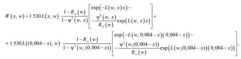 где ψ(w, x) = R(w) exp(–L(w, х) х); ψ(w, (0,004 – x)) = = R(w) exp(–L(w, (0,004 – x)) х); R и L – получаемые расчетным путем оптические характеристики объекта исследования, м–1Величина R характеризует спектральную отражательную способность оптически полубесконечного слоя. Коэффициент L, м–1, отображает эффективное ослабление потока излучения по мере его распространения в оптически бесконечно толстом слое.  В результате расчетов получены следующие уравнения оптических характеристик: