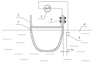 3 – electrical measuring device (millivoltmeter); 4 – clamping contact; 5 – reference electrode; 6 – sea water