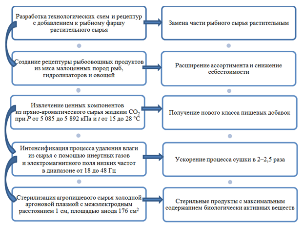 На рис. 1 приведены инновационные решения в переработке агропищевого сырья, в частности возможности обогащения рыборастительных продуктов белковыми гидролизатами из мяса рыб малоценных пород. Предложено использовать в качестве антиоксидантных обогатителей СО2-экстракты из пряно-ароматического и лекарственного растительного сырья.
