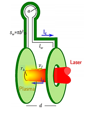 В последние годы альтернативным направлением доставки по лазерному лучу электроэнергии к ДЭК рассматривается генерация мощных импульсов тока и магнитных полей по методу «конденсатор-катушка» (КК) [6–9]. Конденсатор образуют два сближенных торца индуктивной катушки. Через отверстие в одном из торцов излучение фокусируется на поверхности второго торца-мишени. При интенсивности излучения свыше 1010 Вт/см2 происходит ионизация поверхностного слоя материала мишени, выход из нее горячих электронов, образующих приповерхностную плазму (ППП) внутри конденсатора. Под действием сторонних сил неэлектрической природы заряды в плазме разделяются и возникает электродвижущая сила (ЭДС), поддерживающая за время длительности оптического импульса поток носителей заряда через катушку. Разрядный ток конденсатора генерирует в катушке индуктивности мощное импульсное магнитное поле.