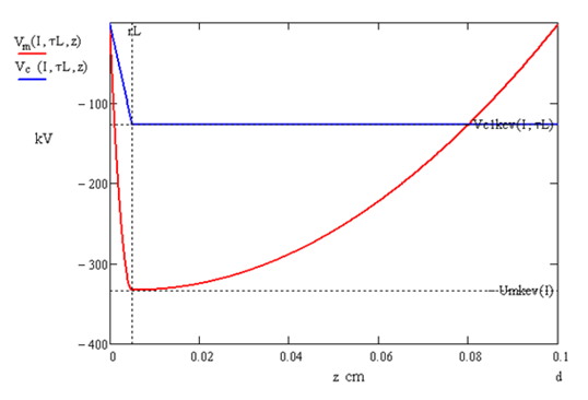 Fig. 2. Quantitative calculation of the potential distribution in the capacitor: stationary distribution at Zf ≈ rh (vertical dotted line) – solid blue line; transitional distribution before potential balancing (capacitor potential barrier) – red line; radiation