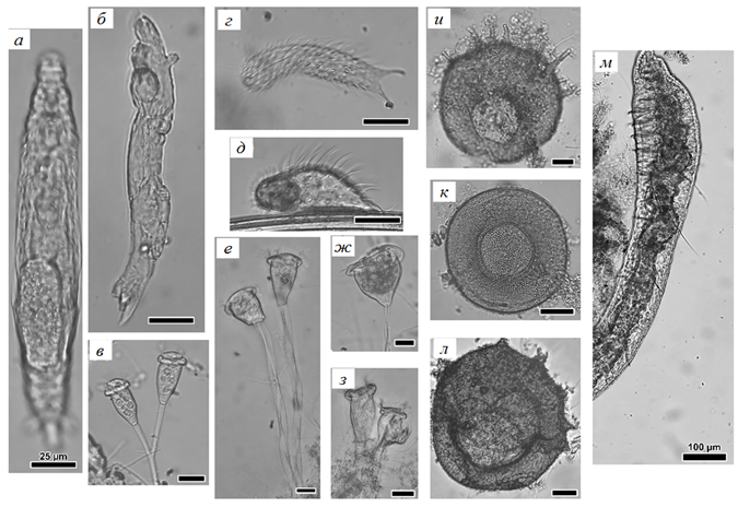 ж – Vorticella campanula; з – Zoothamnium sp.; и – Centropyxis aculeata; к – Arcella vulgaris; л – Centropyxis sp.;
