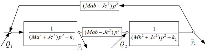 Приведенная к координатам {y1, y2} на основе известных методов [9, 10] механическая колебательная система (см. рис. 1) может быть представлена в виде структурной схемы (рис. 2), где p = jω – комплексная переменная; j = √–1; ω – частота внешнего возмущения; символ «–» над переменной обозначает интегральное преобразование Лапласа [15] с учетом нулевых начальных условий.