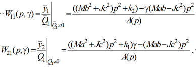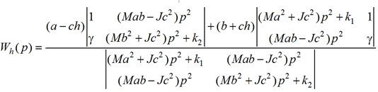 Передаточные функции (1), (2) системы (см. рис. 1), построенные на основе структурной схемы (см. рис. 2), могут быть использованы для построения передаточной функции, для которой входным сигналом является гармоническое колебание внешнего силового возмущения, а выходным сигналом – колебание фиксированной точки твердого тела. В частности, для оценки динамических особенностей движений твердого тела в точке H (см. рис. 1) может быть использована передаточная функция